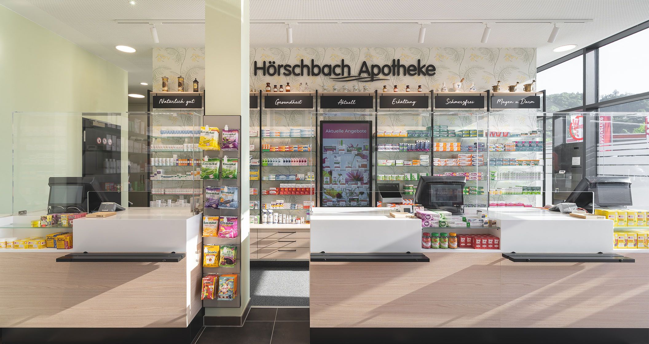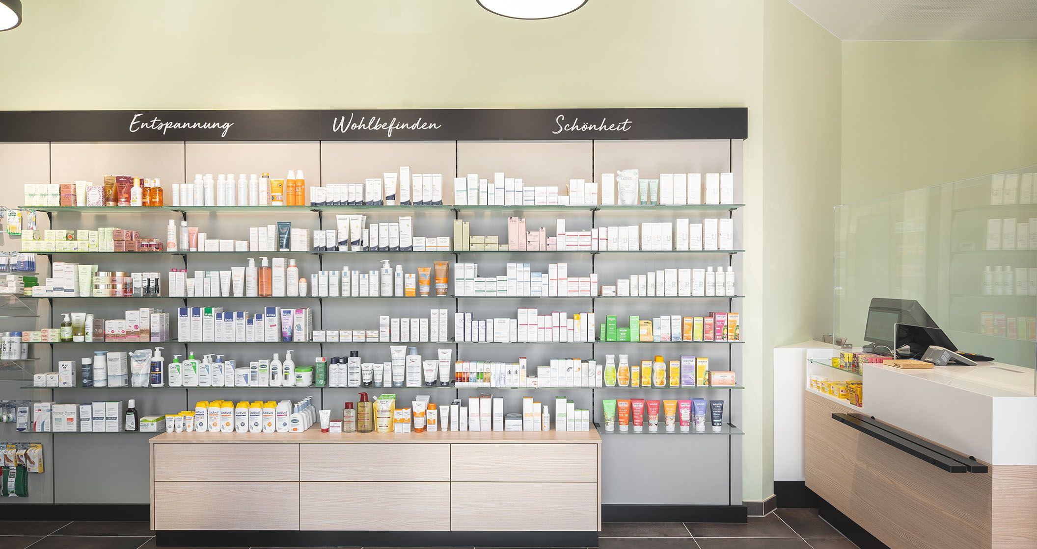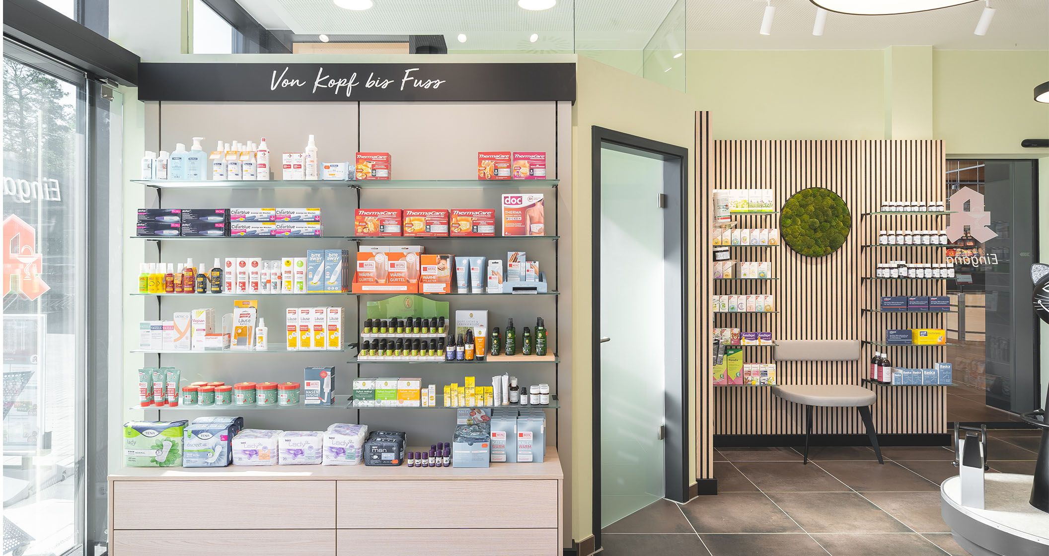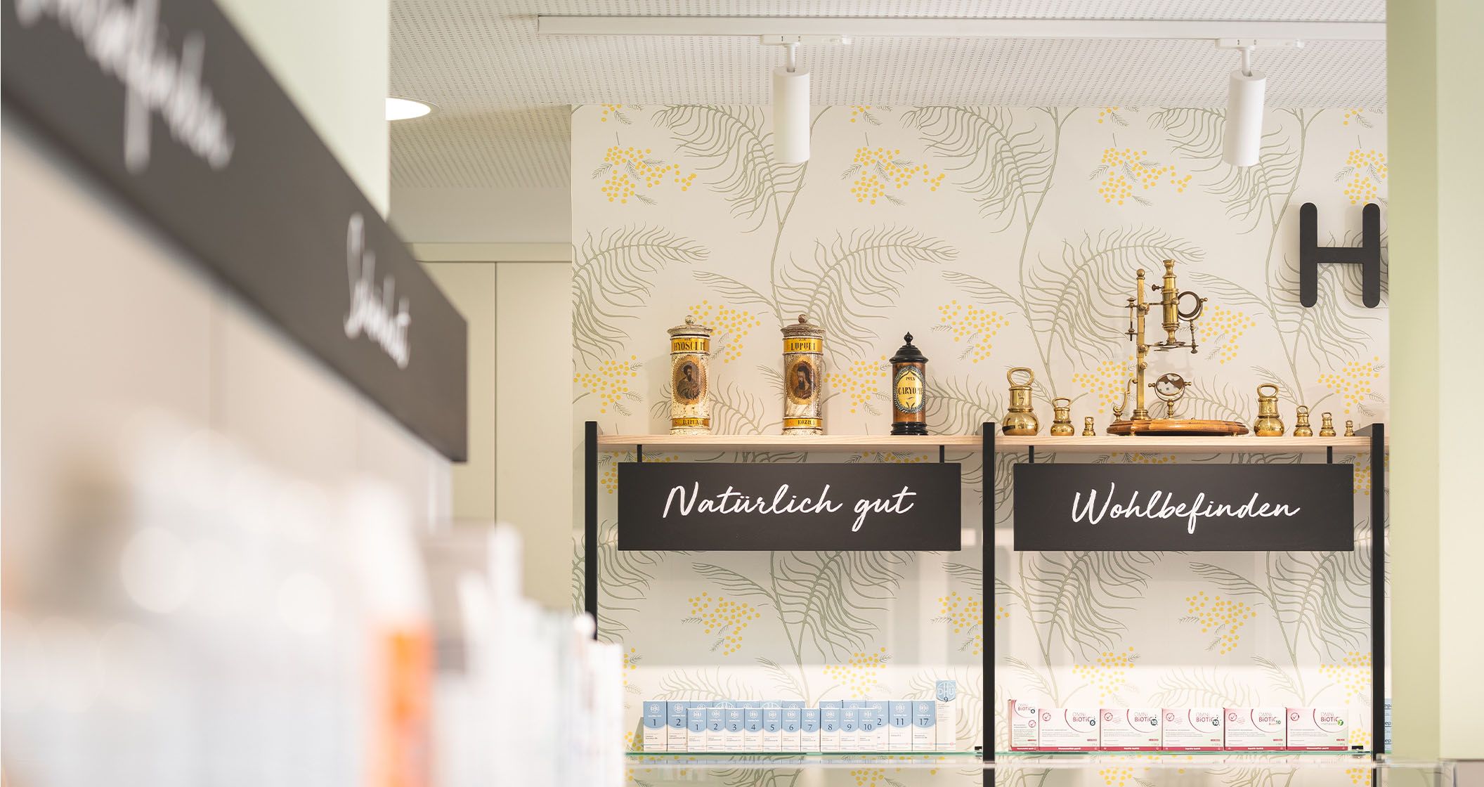 Schlagworte in geschwungener Schreibschrift helfen sich im Produktdschungel zurecht zu finden. Alte Apothekergläser, Mörser und weitere liebevoll platzierte Deko-Objekte schlagen die Brücke zwischen Tradition und Moderne.