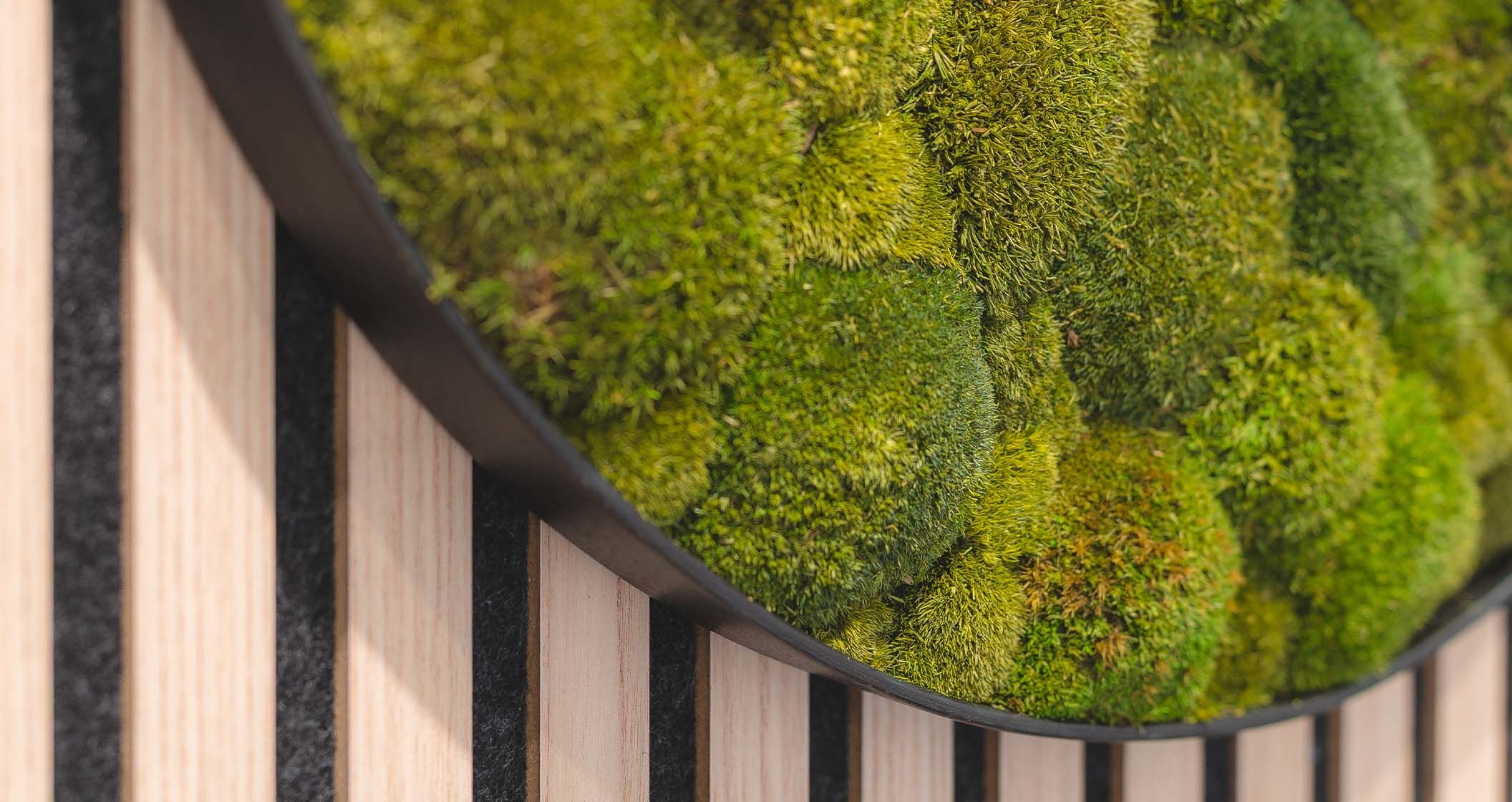 Besonderes Element ist das maßgefertigte Sitzmöbel unter dem Moosbild, das Wartende zum Innehalten einlädt und sich gleichzeitig als Hingucker harmonisch in den Raum einfügt.