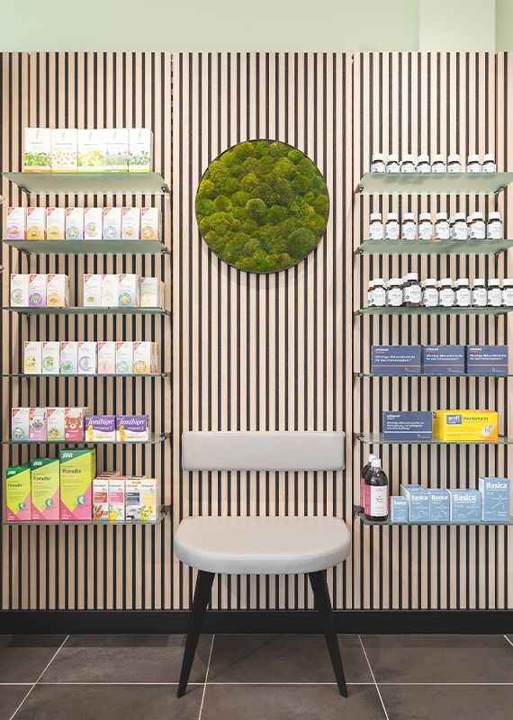 Als Kontrast zur bunten Produktvielfalt setzten wir auf eine reduzierte, klare und moderne Formsprache. Gleichzeitig erfüllen wir den Wunsch nach einer natürlichen, naturverbundenen Atmosphäre, indem wir den Werkstoff Holz gezielt einsetzen.