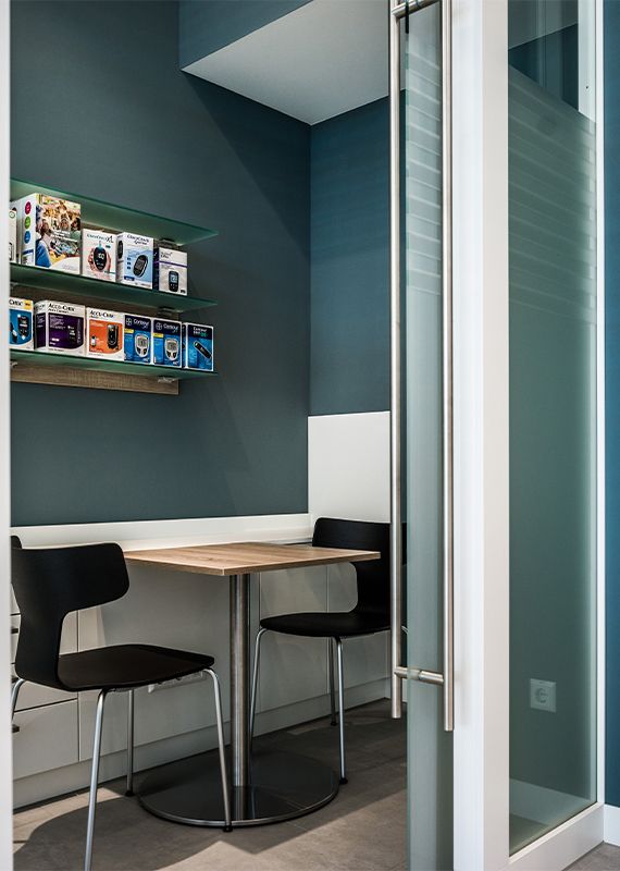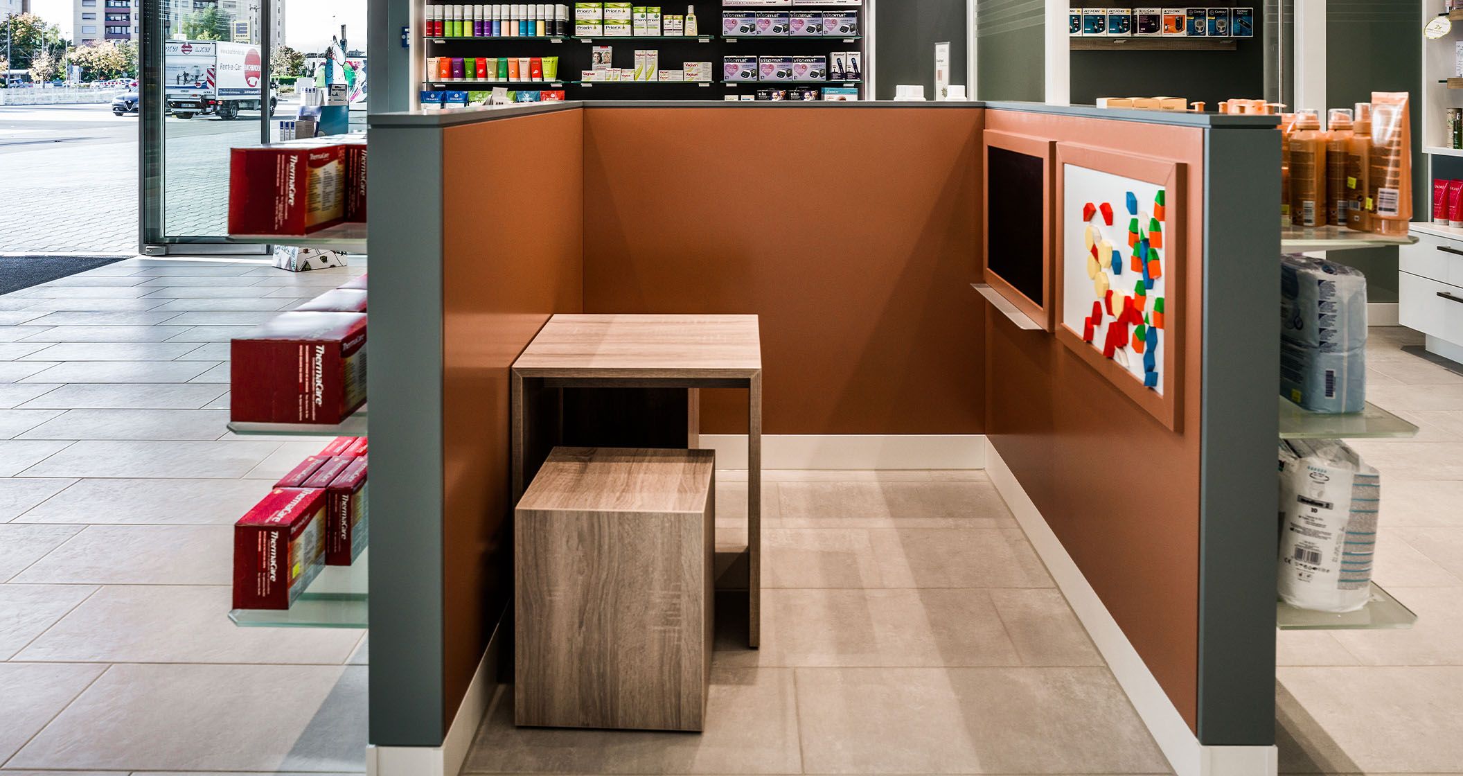 Die großzügige Grundfläche der Hardt Apotheke bietet genügend Platz für zwei Mittelblöcke als Verkaufselemente, die zusätzliche Aufgaben übernehmen. Ein Mittelblock dient als Ablage und Sitzbank, während der andere eine Kinderecke aufnimmt, sodass auch die Kleinen während des Apothekenbesuchs gut aufgehoben sind. Zudem gibt es einen abgetrennten Beratungsraum, der diskrete und persönliche Gespräche ermöglicht.