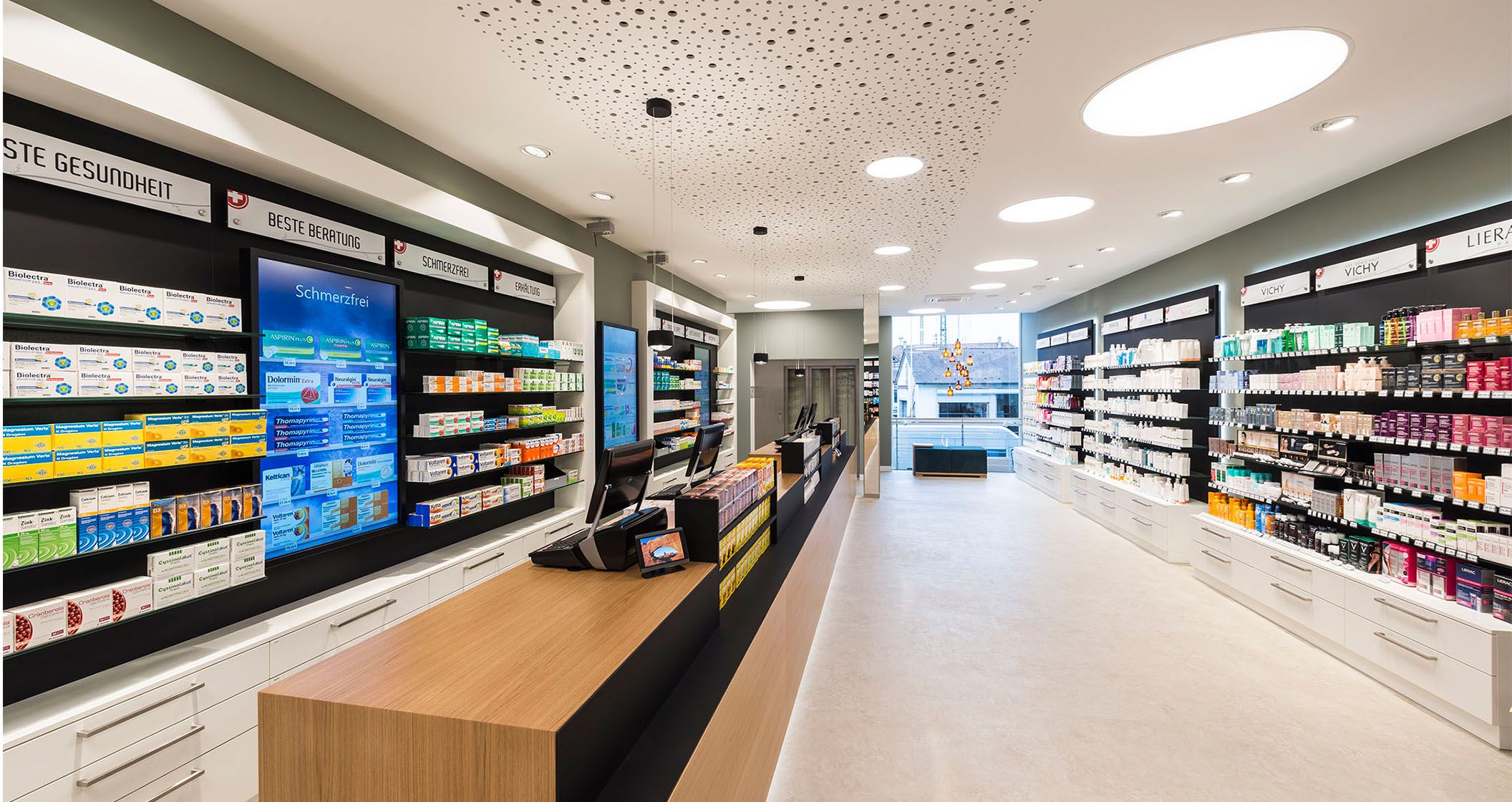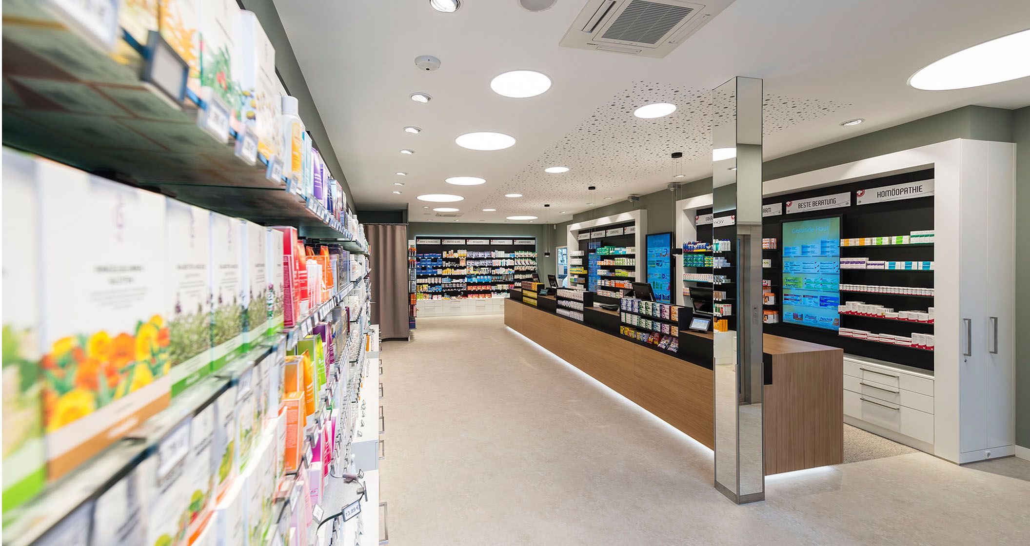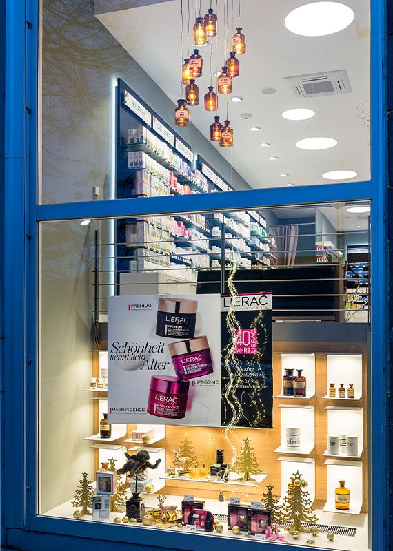 Die Nürtinger Stadtapotheke besticht durch ein geradliniges und minimalistisches Design. Eine angenehme Wohlfühlatmosphäre entsteht durch Verwendung des Werkstoffs Holz beim Verkaufstisch. Dieser trumpft außerdem mit integrierten POS-Feldern auf. Einen Kontrast hierzu liefern die antike Apothekergefäße, die einen Hauch Nostalgie versprühen.