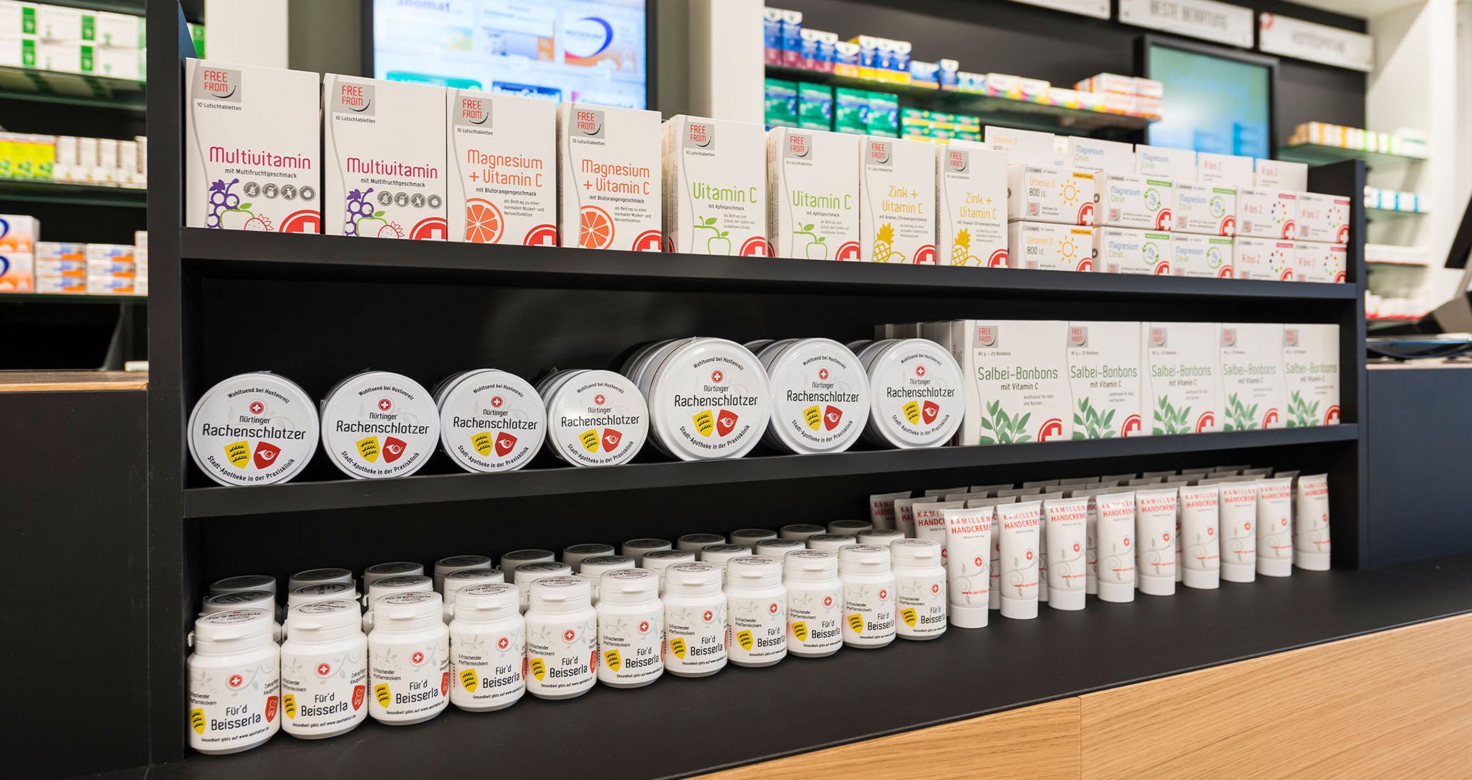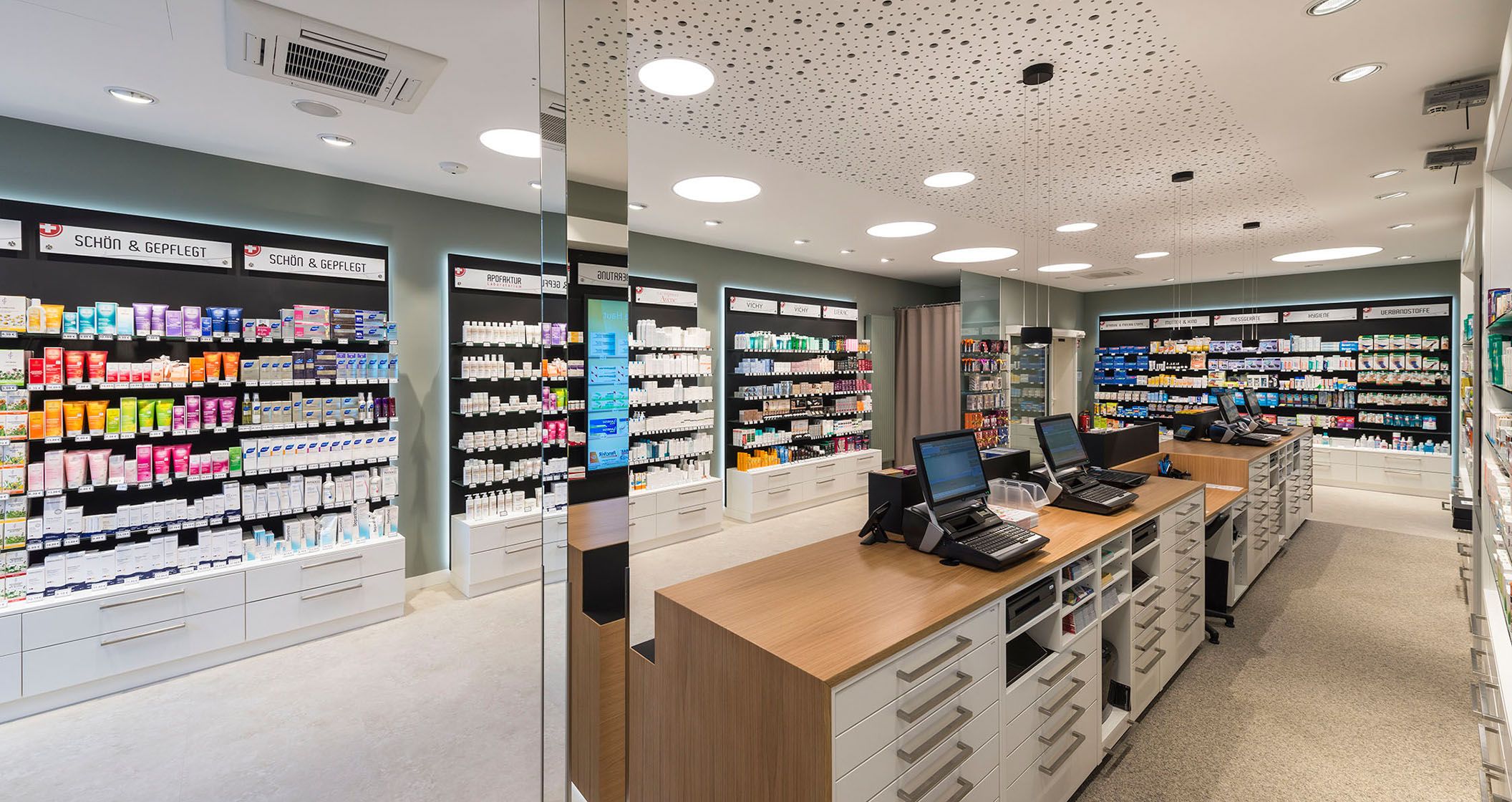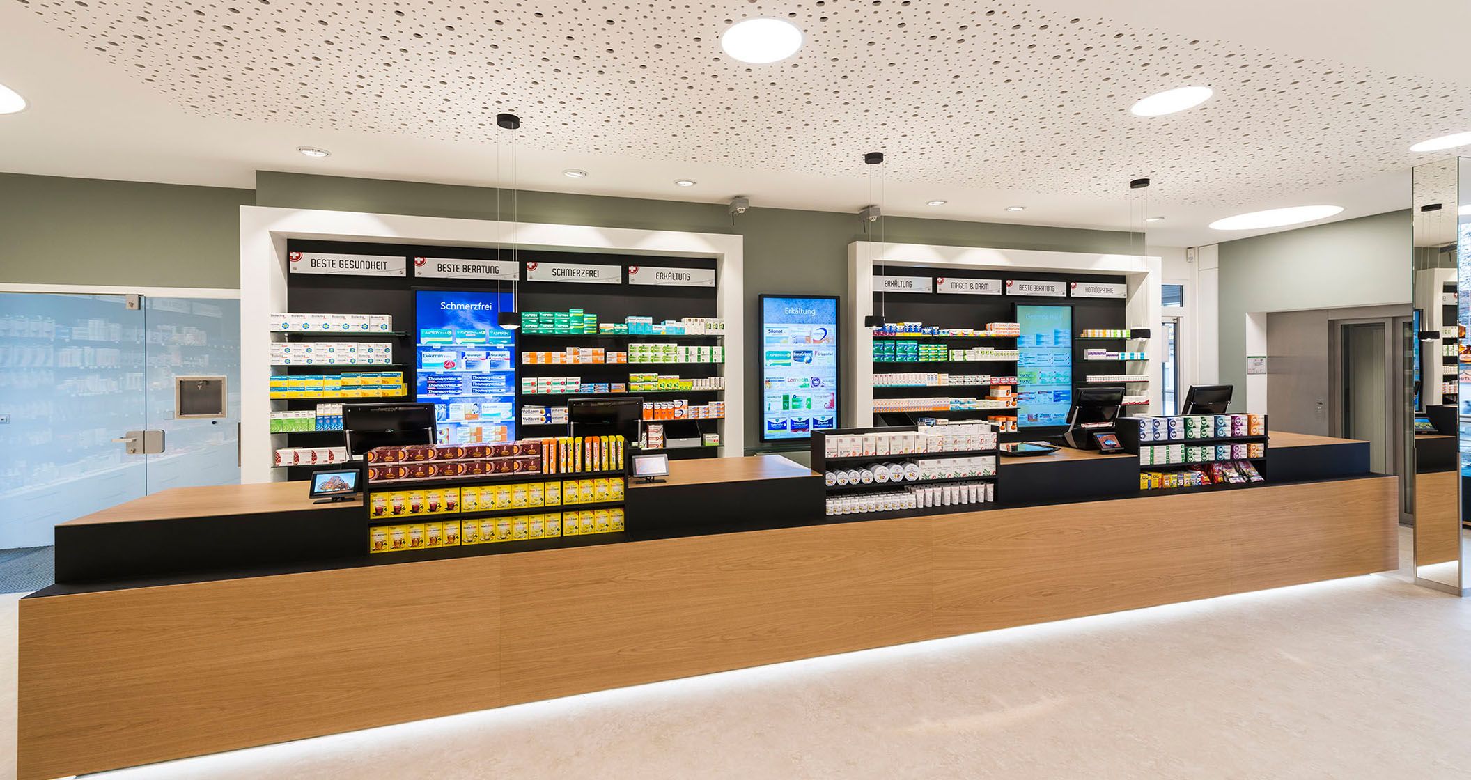 Die Nürtinger Stadtapotheke besticht durch ein geradliniges und minimalistisches Design. Eine angenehme Wohlfühlatmosphäre entsteht durch Verwendung des Werkstoffs Holz beim Verkaufstisch. Dieser trumpft außerdem mit integrierten POS-Feldern auf. Einen Kontrast hierzu liefern die antike Apothekergefäße, die einen Hauch Nostalgie versprühen.