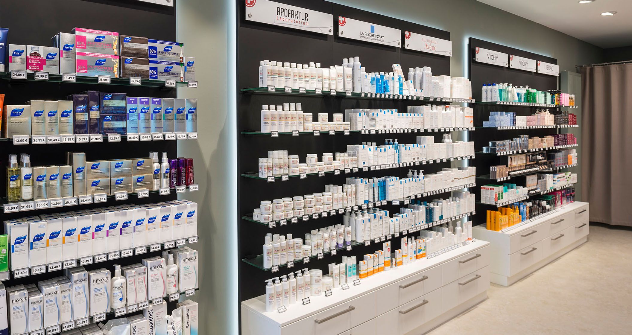 Die freischwebenden, beleuchteten Glasfachböden integrieren sich nahtlos in den Raum und verleihen der Apotheke eine gewisse Leichtigkeit. Neben Entwurf, Planung und Fertigung, kümmerten wir uns auch bei diesem Projekt um die Umsetzung und regelkonforme Abnahme.