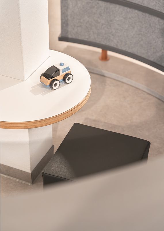 Aufgrund der Lage in der Nähe einer Kinderarztpraxis und um für ein entspanntes Einkaufserlebnis zu sorgen, entschieden wir uns, die große runde Mittelgondel, die als Präsentationsfläche für Produkte dient im „Inneren“ mit Platz zum Sitzen und Spielen für Kinder auszustatten.