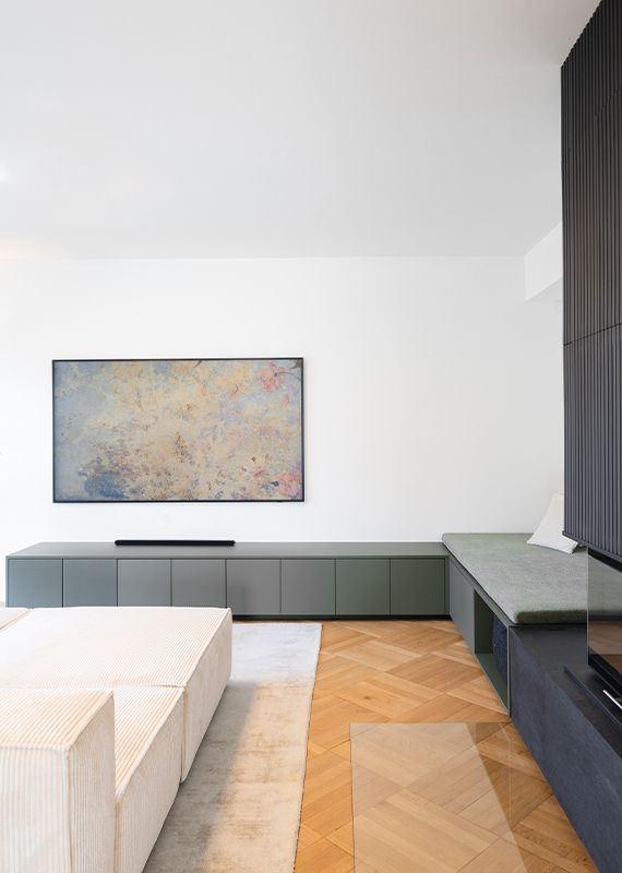 Haus kus Wohnlichkeit trifft auf Funktion – versteckte Technik und ein Kamin als elegantes Raumelement.